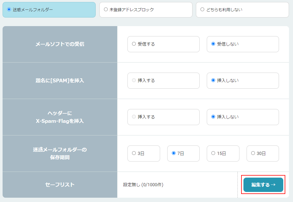 迷惑メールフォルダーの設定方法は、こちらをご覧ください。 - 3「編集する」をクリックします。