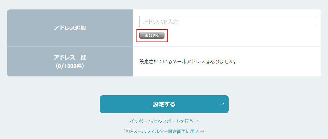 - 4「アドレスを入力」欄にセーフリストに追加するメールアドレスを入力し、「追加する」をクリックします。
