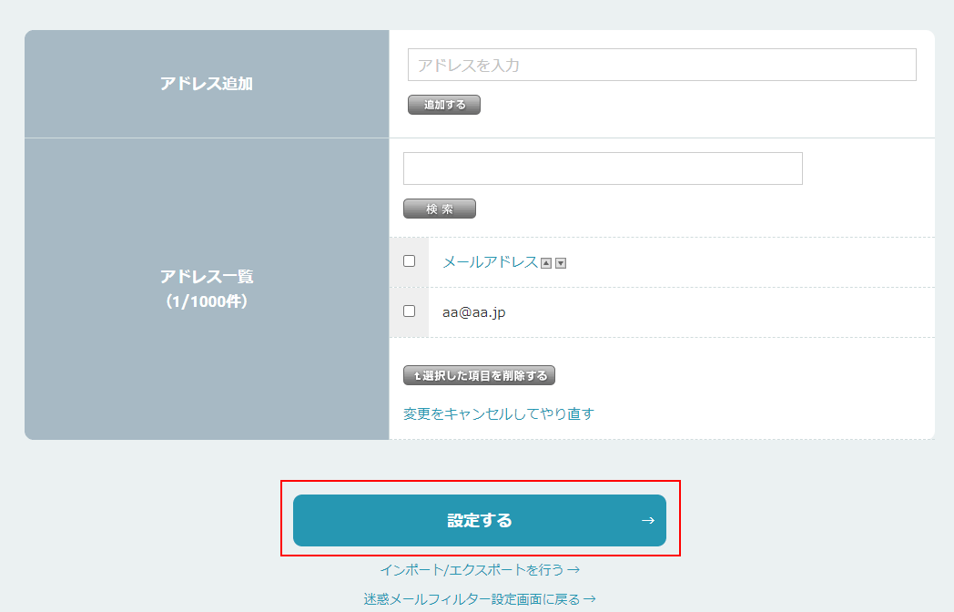 ※「設定する」をクリックしないと、設定は反映されません。 - 1迷惑メール対策設定一覧ページにログインします。