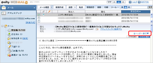 2.メール右上の [ 全ヘッダー表示 ] をクリックします。