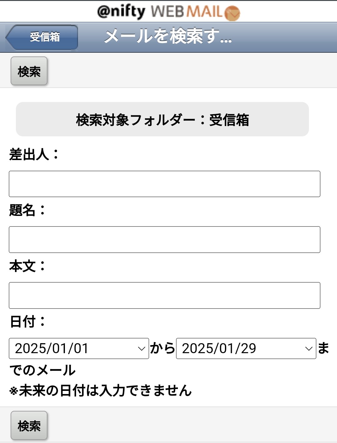 1.削除したいメールを検索します。「詳細検索」機能を利用すれば、メールの受信日付でメールを絞り込むことができます。