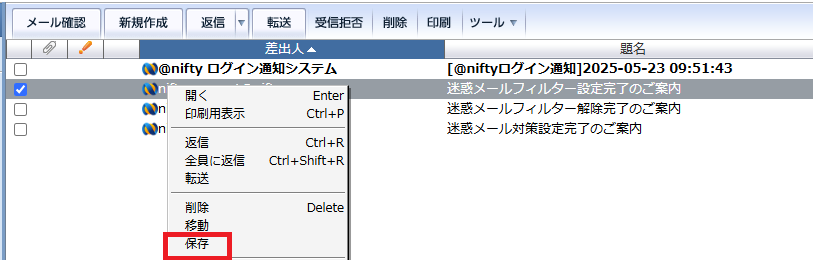 にログインして、保存希望のメールにカーソルをあわせて右クリックをします。