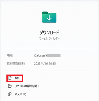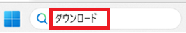 パソコン画面下部の検索窓で「ダウンロード」と入力します。ダウンロードが表示されたら「開く」を選択します。