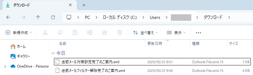 ダウンロードフォルダを開くとeml形式でメールが保存されています。