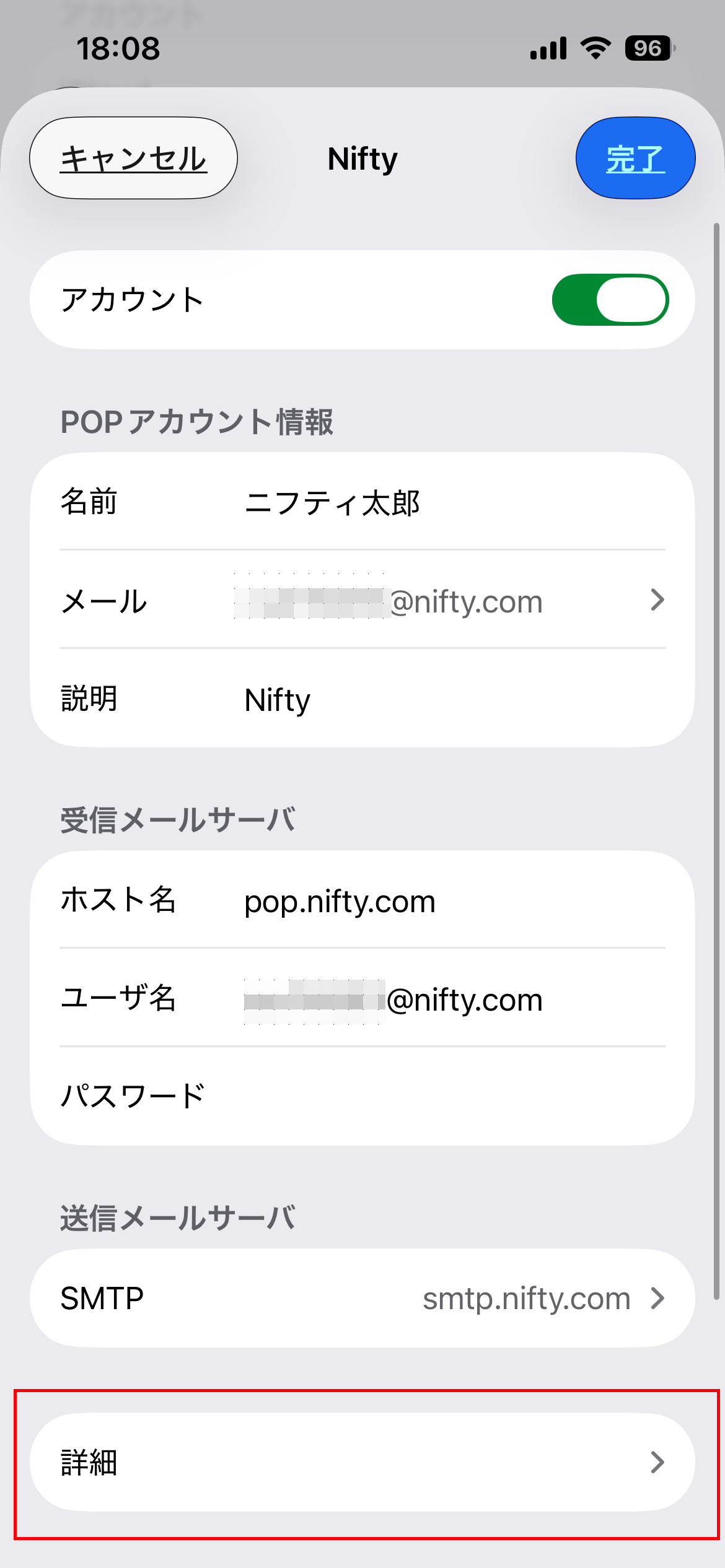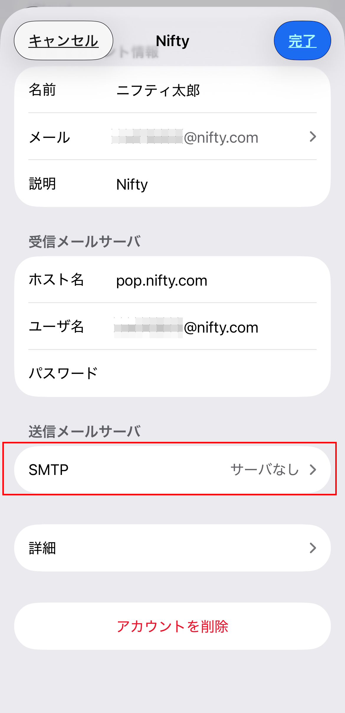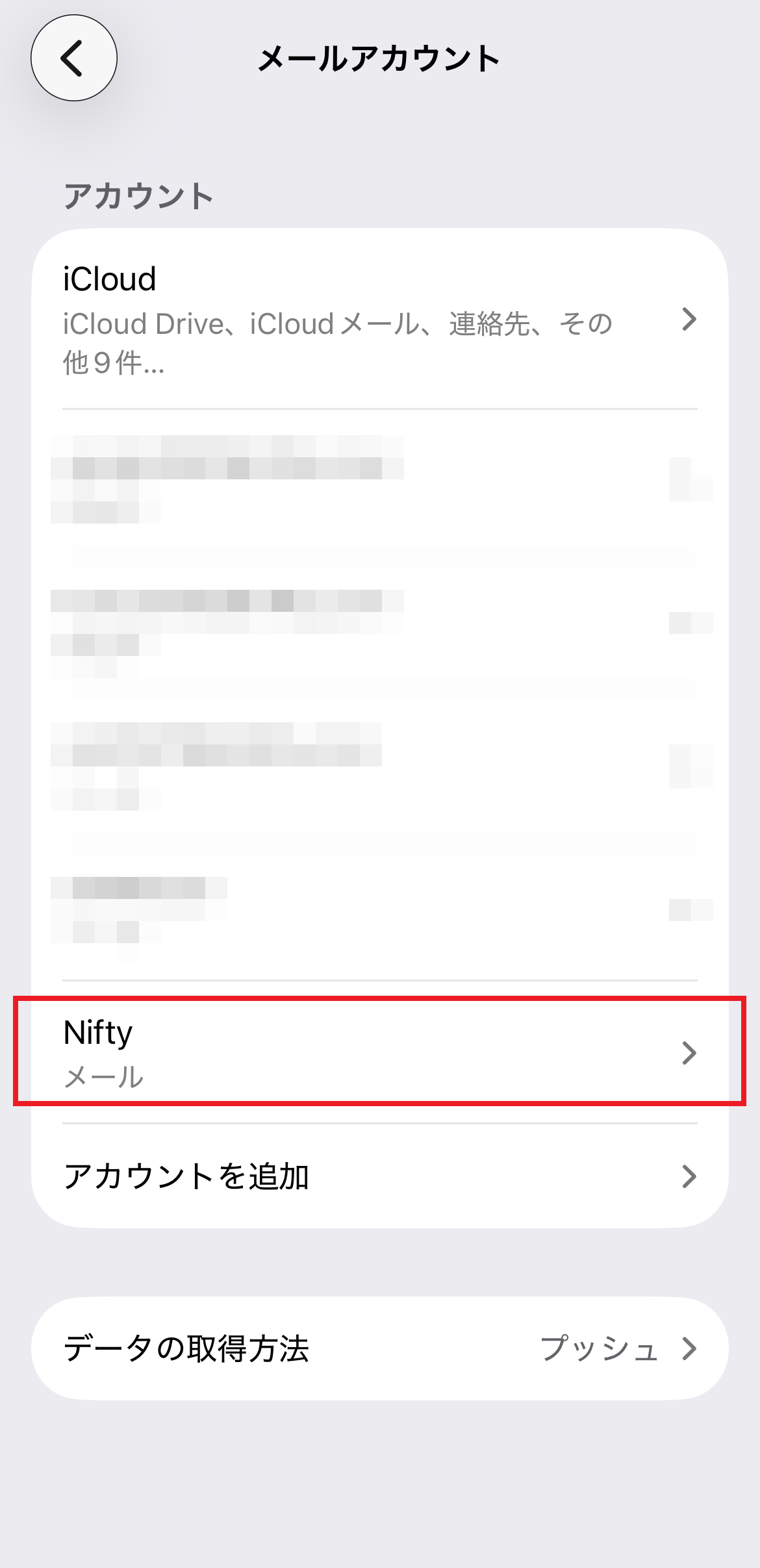 10.「メールアカウント」画面に戻ります。設定したアカウント(Nifty)をタップします。