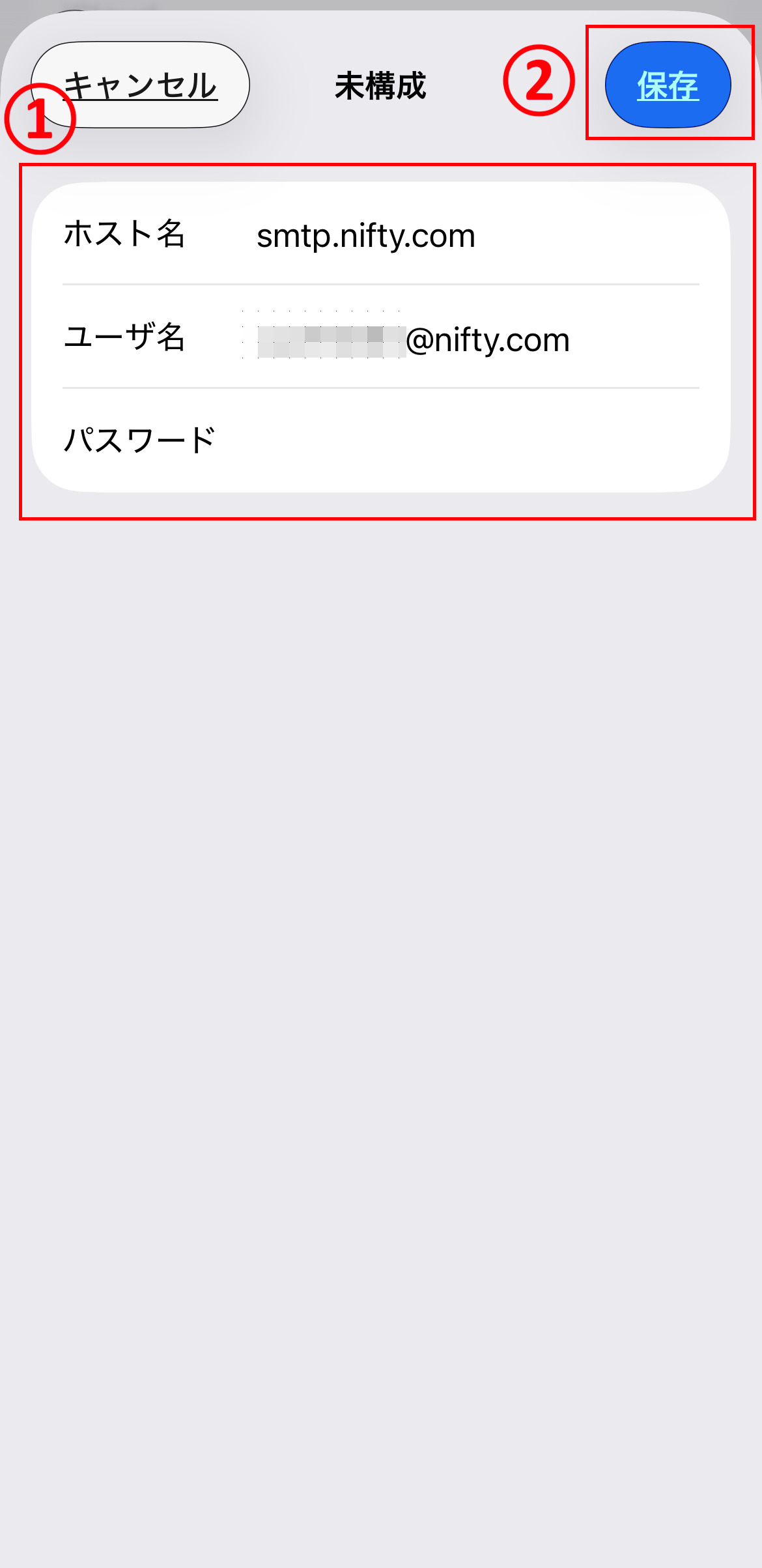 ホスト名 smtp.nifty.com ユーザ名 メールアドレスを入力します。(例:abc12345@nifty.com) パスワード ※ 手順8で入力したパスワードが引き継がれています。