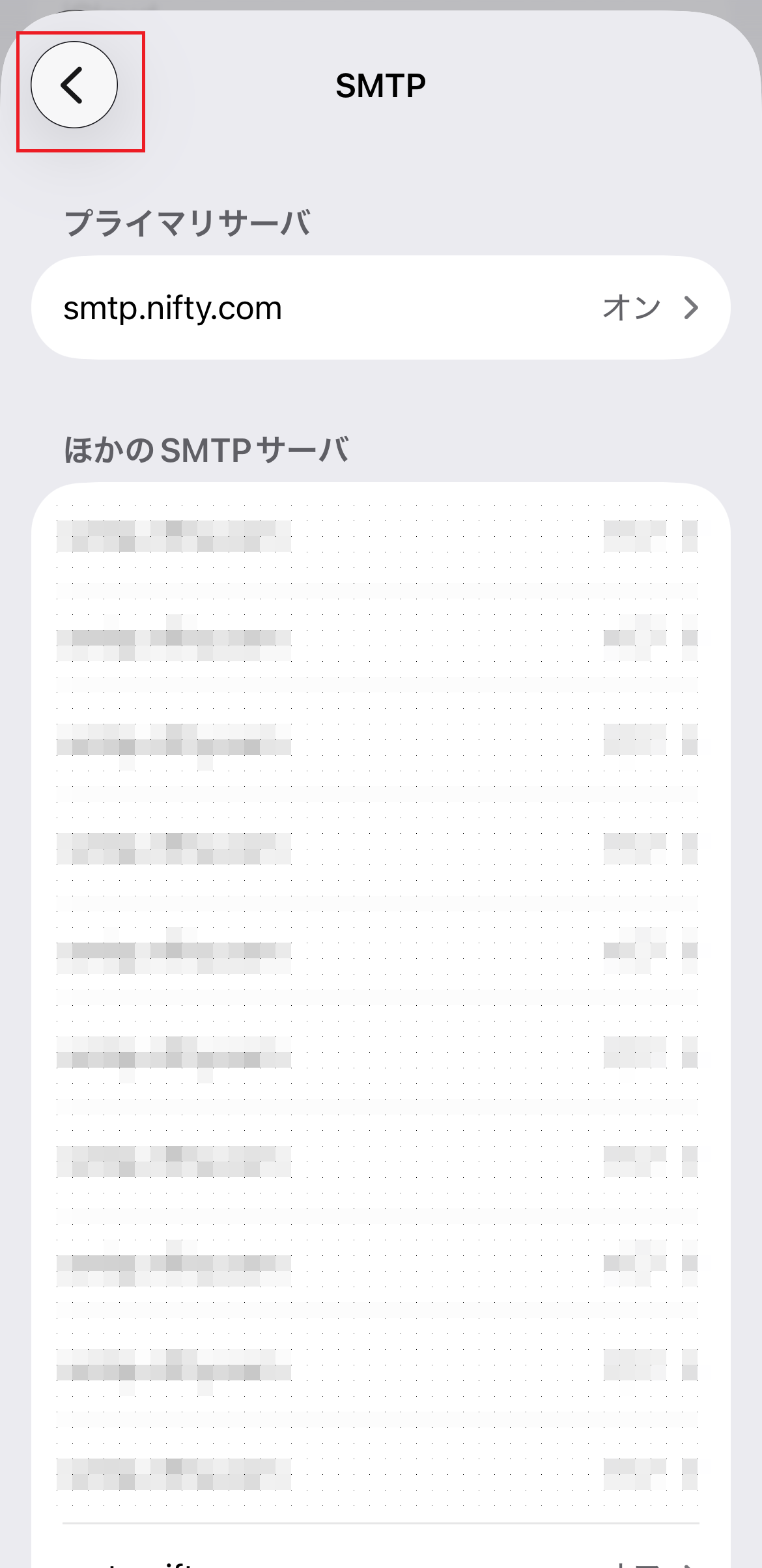14.「SMTP」画面に戻ります。画面左上の戻るボタン(<)をタップします。