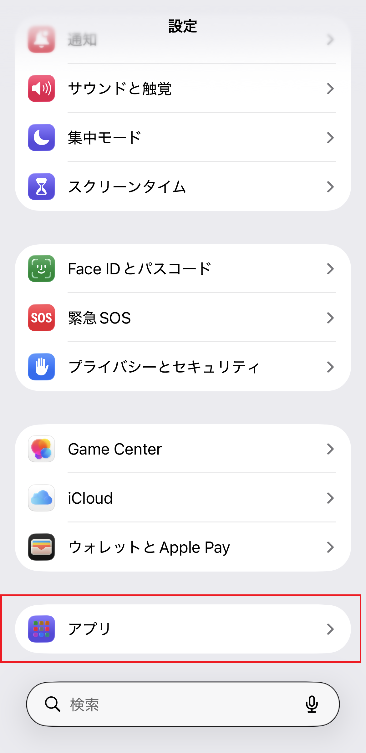 2. 「設定」画面が表示されたら、下にスクロールし[アプリ]をタップします。