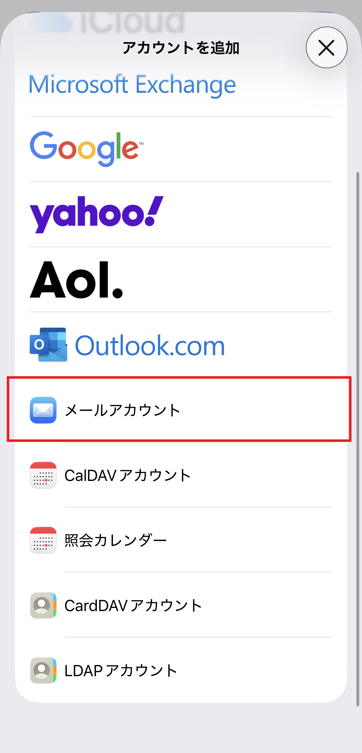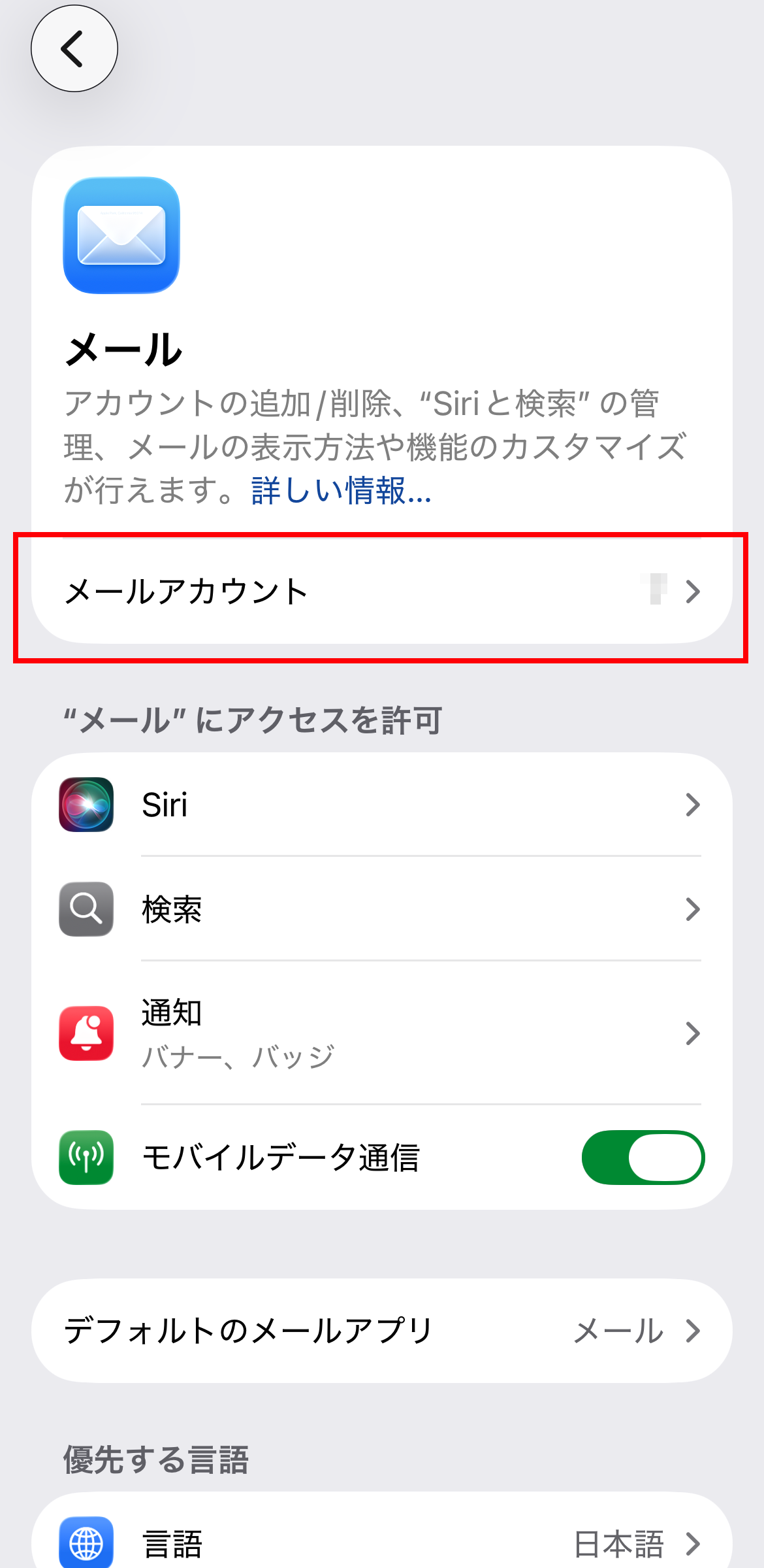 4. 「メール」画面が表示されます。[ メールアカウント ] をタップします。