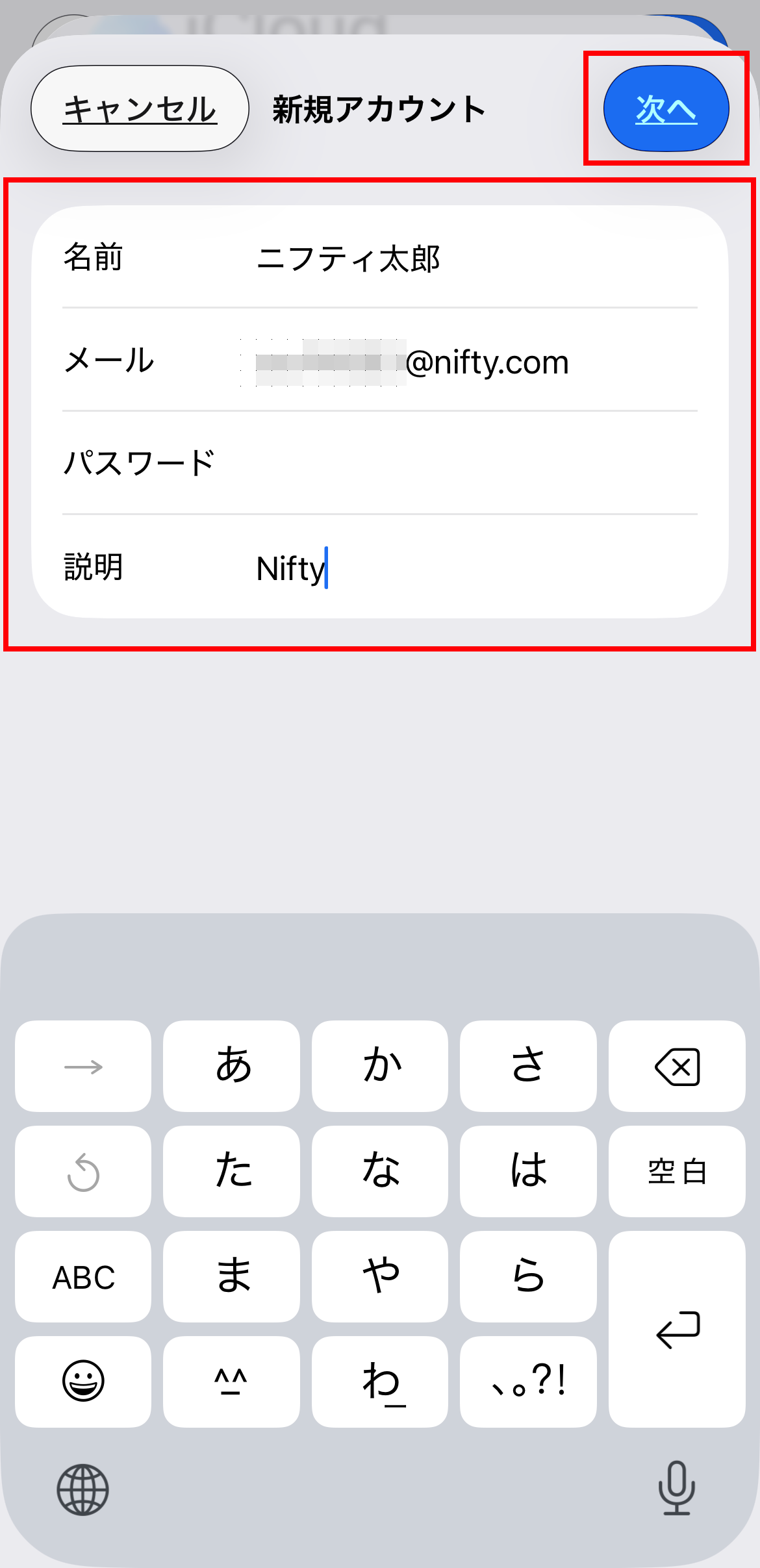 [ 名前 ] [ メール ] [ パスワード ] 欄をそれぞれタップし、以下のように入力して右上の [ 次へ ] をタップします。