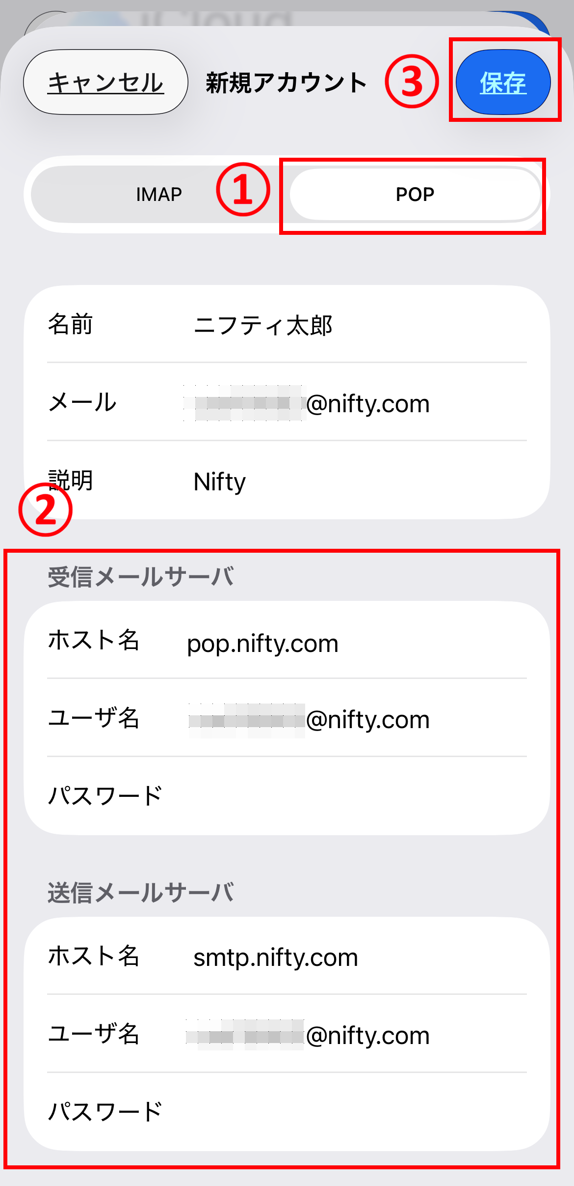 ホスト名 pop.nifty.com ユーザ名 メールアドレスを入力します。(例:abc12345@nifty.com) パスワード ※ 手順8で入力したパスワードが引き継がれています。