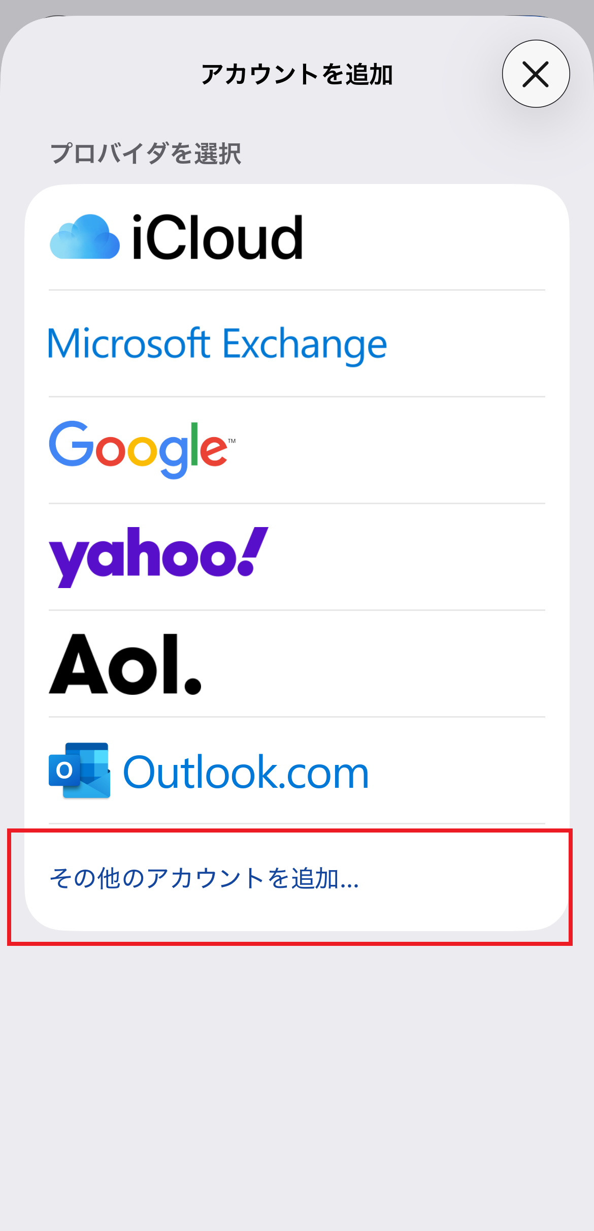 7. プロバイダの選択画面が表示されたら、「その他のアカウントを追加…」をタップします。画面が変わったら、「メールアカウント」をタップします。