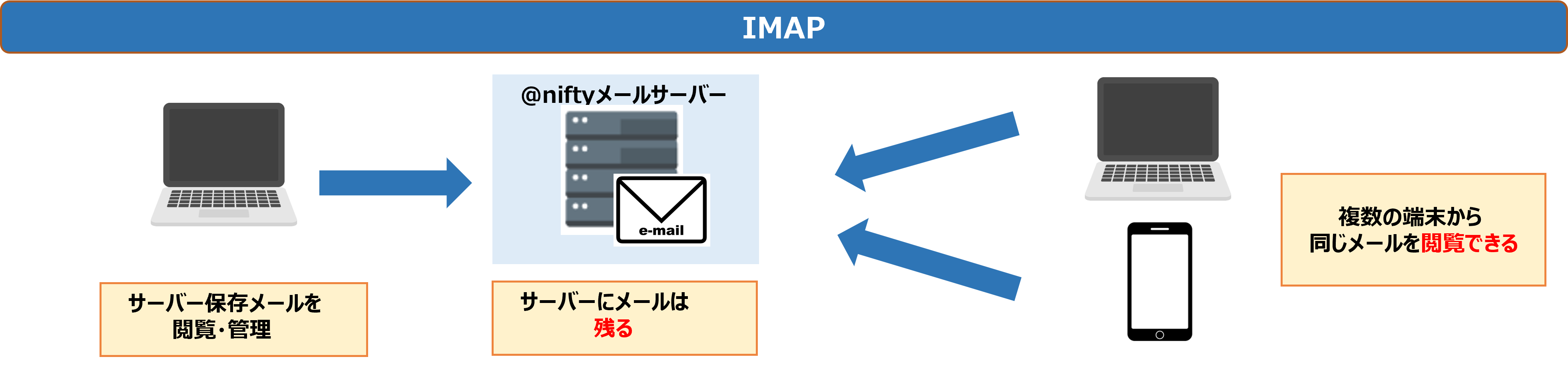 IMAPは、メールをメールサーバー上に保持したままアクセスするためのプロトコルです。メールのコピーが端末にダウンロードされるのではなく、サーバー上のメールに直接アクセスして閲覧・管理します。