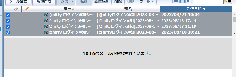 ・一度に選択できるメールの通数を300通から100通に変更いたしました。