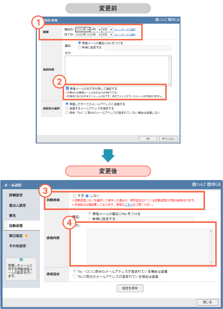 1. 【1】自動返信の期間を設定することはできなくなります。