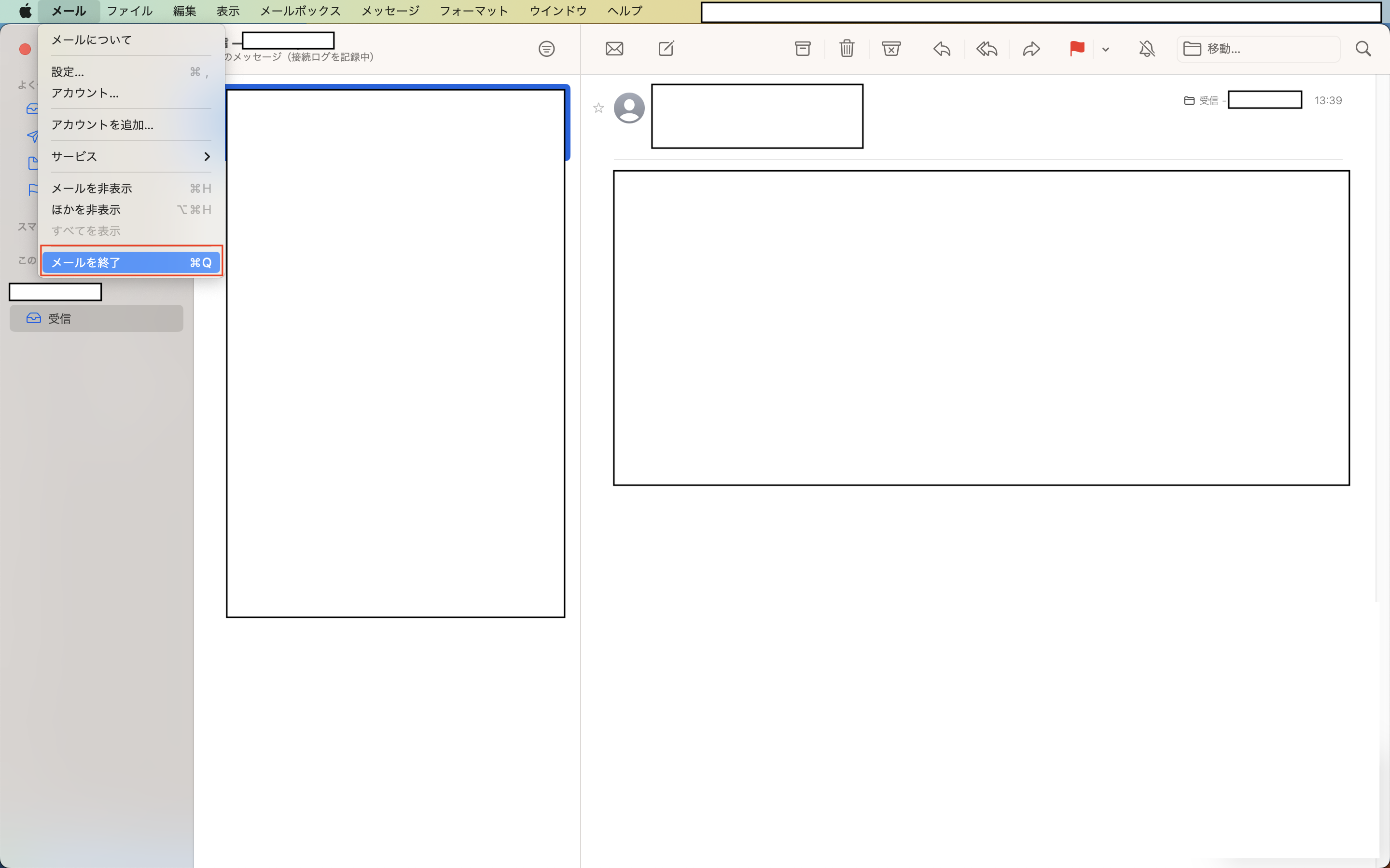 1. MacPCの上部のメニューバーから「メール」を選択いただき、「メールを終了」をクリックしてください。