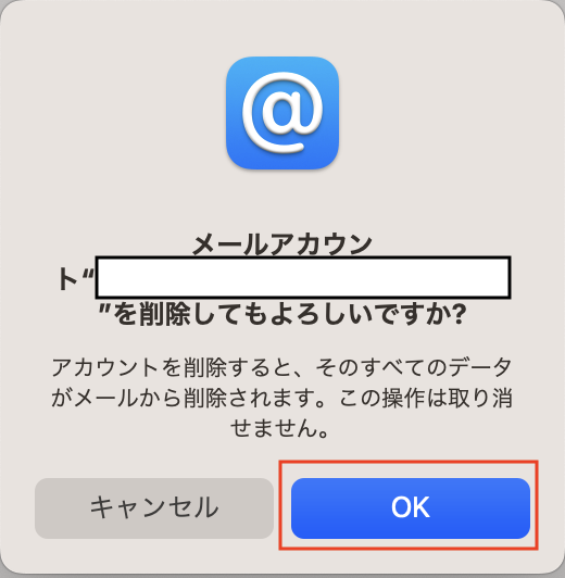 4. 削除確認ダイアログが表示されます。メールアカウントをご確認の上、「OK」ボタンをクリクしてください。