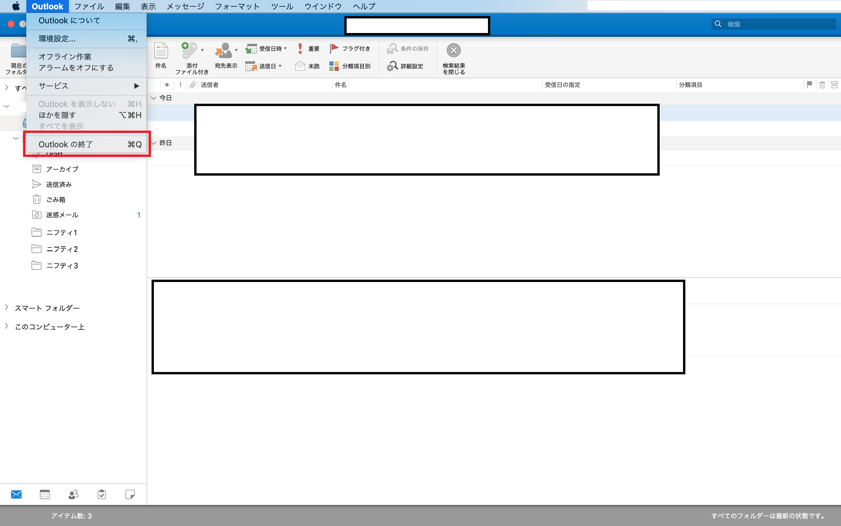 - ※ 上部のメニューバーに「Outlook」の選択がない場合は、一度Outlookアプリの画面の一部をクリックしてください。MacPCの上部のメニューバーは選択されているアプリによって項目が変わります。
