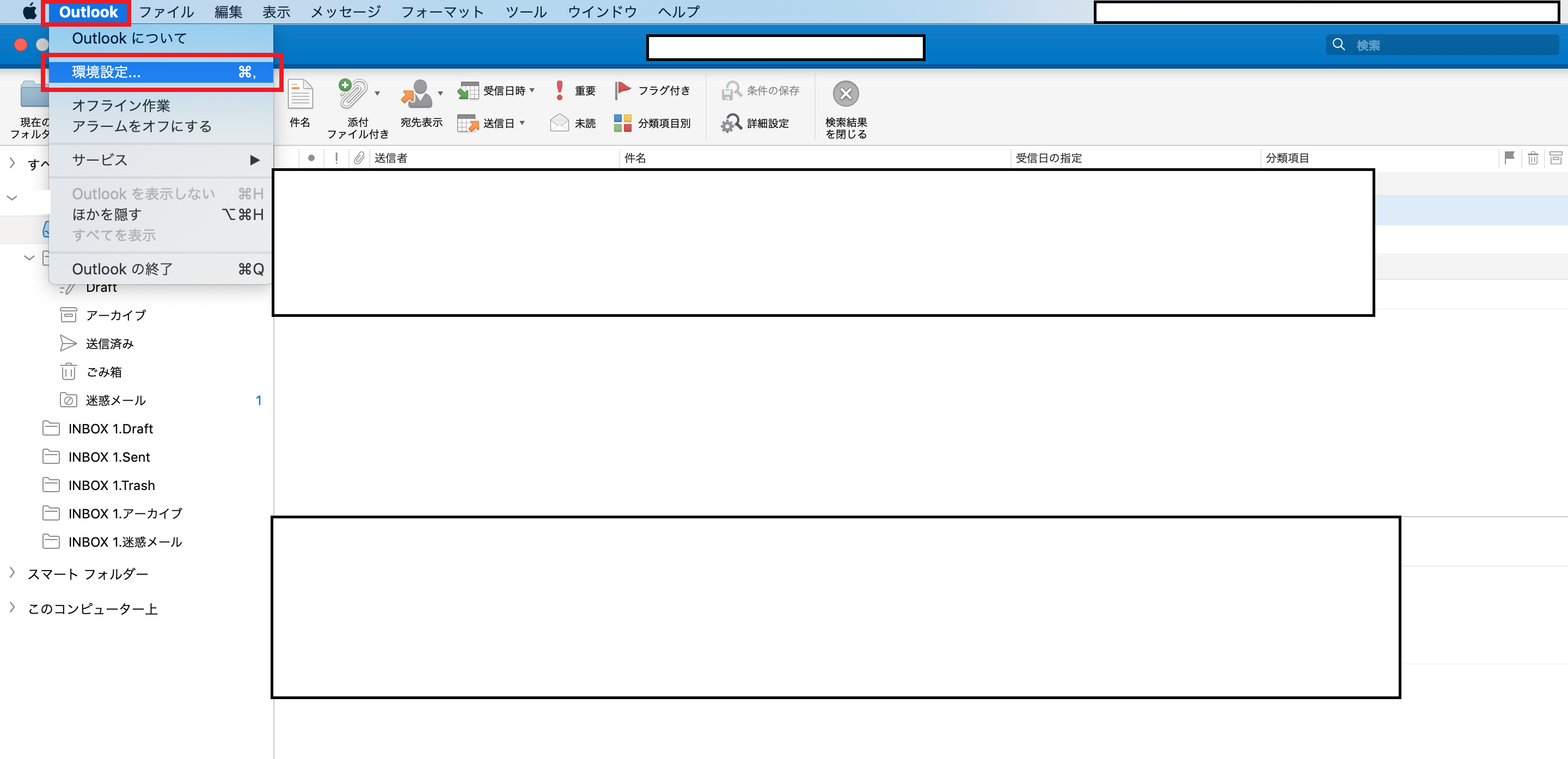 2. MacPC上部のメニューバーから「Outlook」を選択いただき、「環境設定」をクリックしてください。