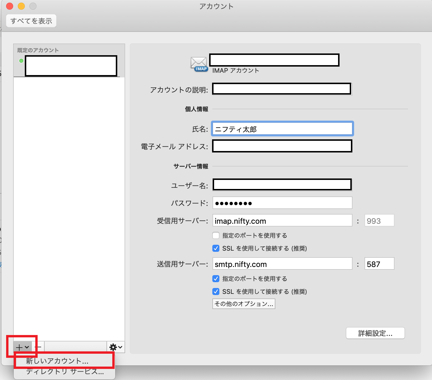 | 受信用メールサーバー | imap.nifty.com | ポート | 993 |