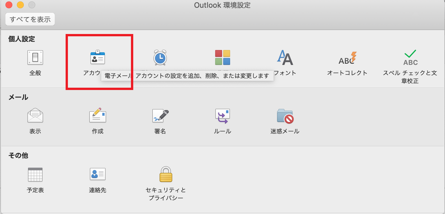 9-1. MacPC上部のメニューバーから「Outlook」を選択いただき、「環境設定」をクリックしてください。