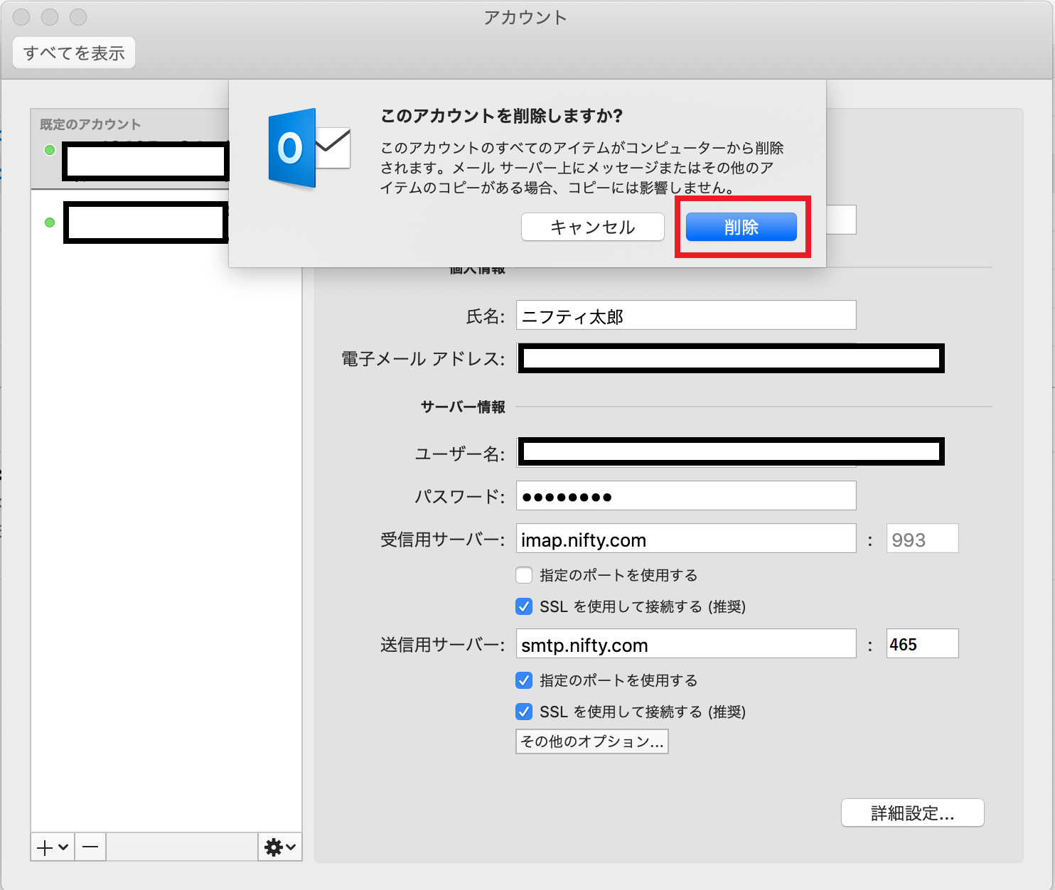 9. 設定の引継ぎが完了したら、元々メールソフトに設定していたアドレスの削除を行います。