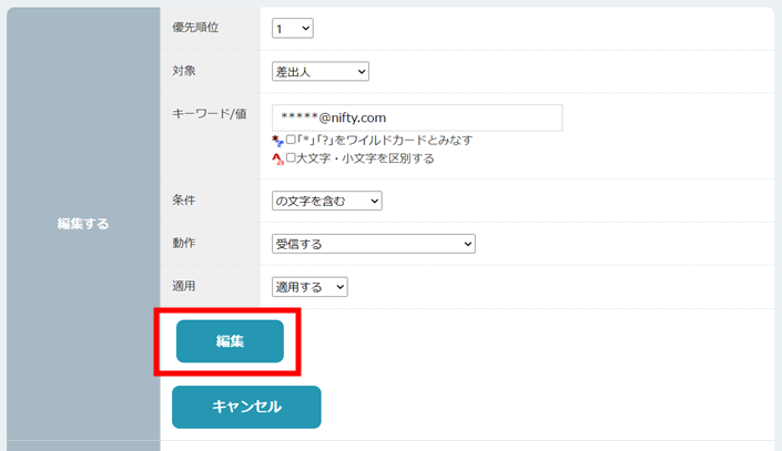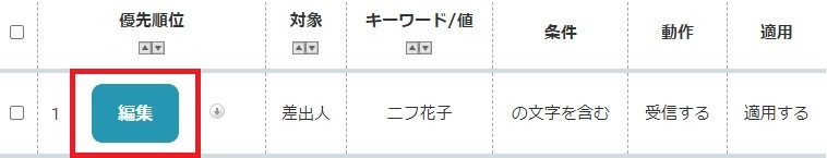 「対象」に「差出人、宛先、CC」いずれか設定していて、条件に「ディスプレイネームを含まない」場合の変更方法はこちら