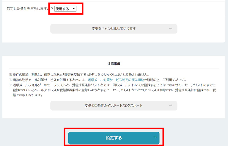 引き続き受信拒否条件をご利用の場合は、以下変更方法をご確認の上、再設定をお願いいたします。